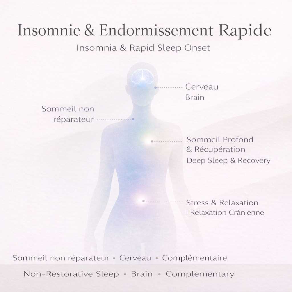 Oui. La combinaison PulseRelax (apaisement nerveux) + stylo d'acupuncture (points calmants) + détente musculaire agit directement sur l'hyperactivité mentale. Le rituel crée aussi un "signal sommeil" qui aide le cerveau à basculer en mode repos.